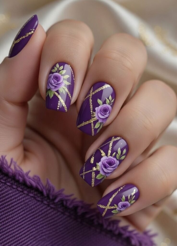 Purple is one of the most versatile colors in nail design. It can be soft and romantic or deep and dramatic. Floral elements add timeless beauty, making the combination suitable for almost any season.