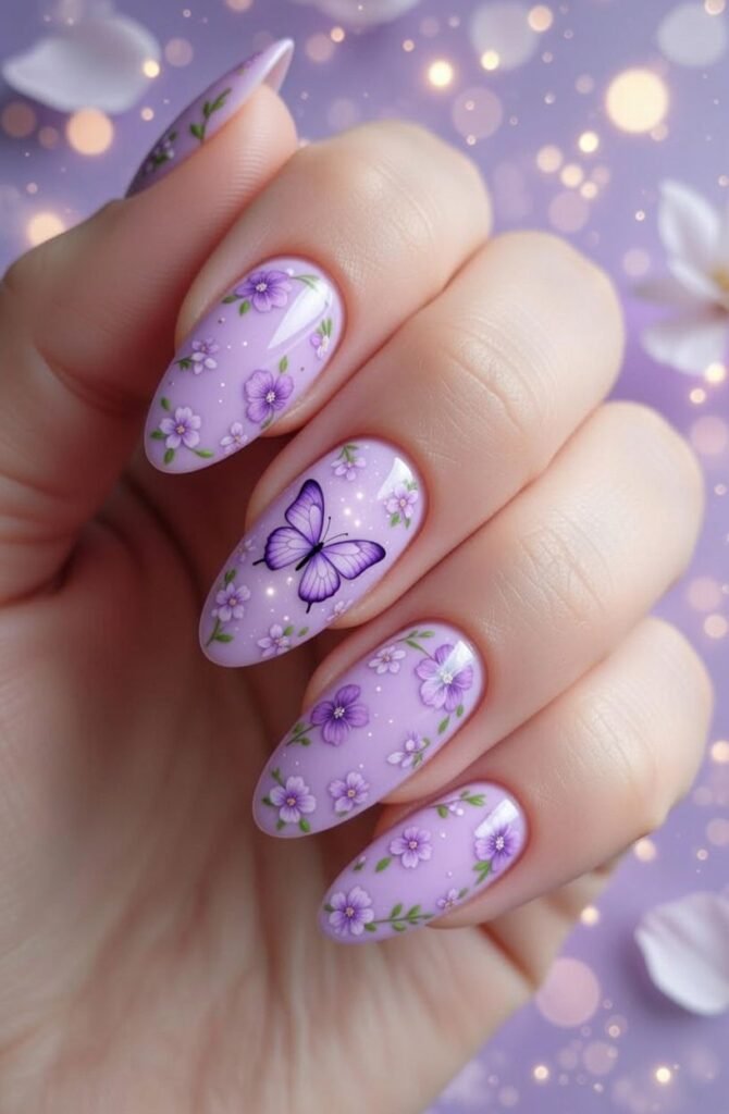 If you love magical, nature-inspired designs, combining floral elements with a butterfly accent creates something truly special. A soft purple base with small floral details keeps the look cohesive, while one accent nail featuring a subtle butterfly design adds charm and personality.